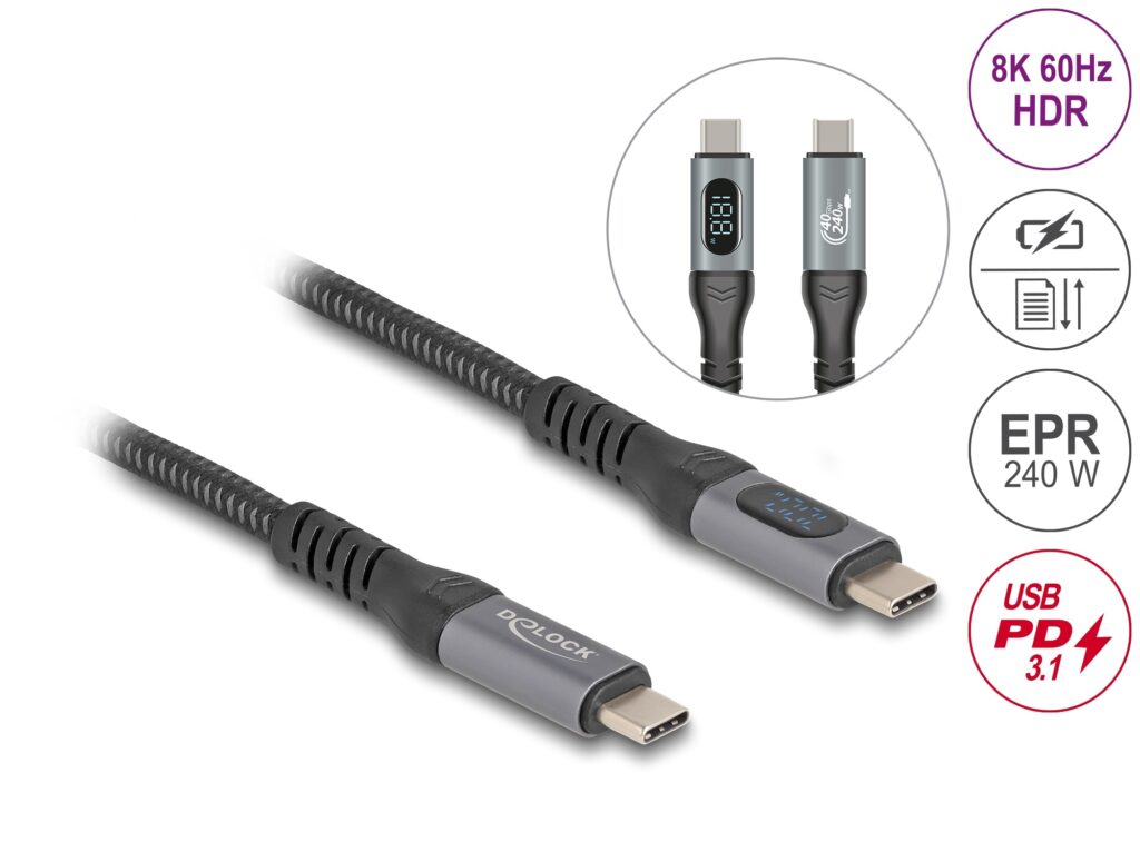 - Cablu coaxial de date + incarcare fast USB 4 type C 8K60Hz/240W/PD 3.1 cu afisaj 1m, Delock 86067: Pentru pasionații de tehnologie, acest model include și un mic afișaj care indică în timp real puterea de încărcare (W), tensiunea (V) și curentul (A), oferind un control vizual complet.